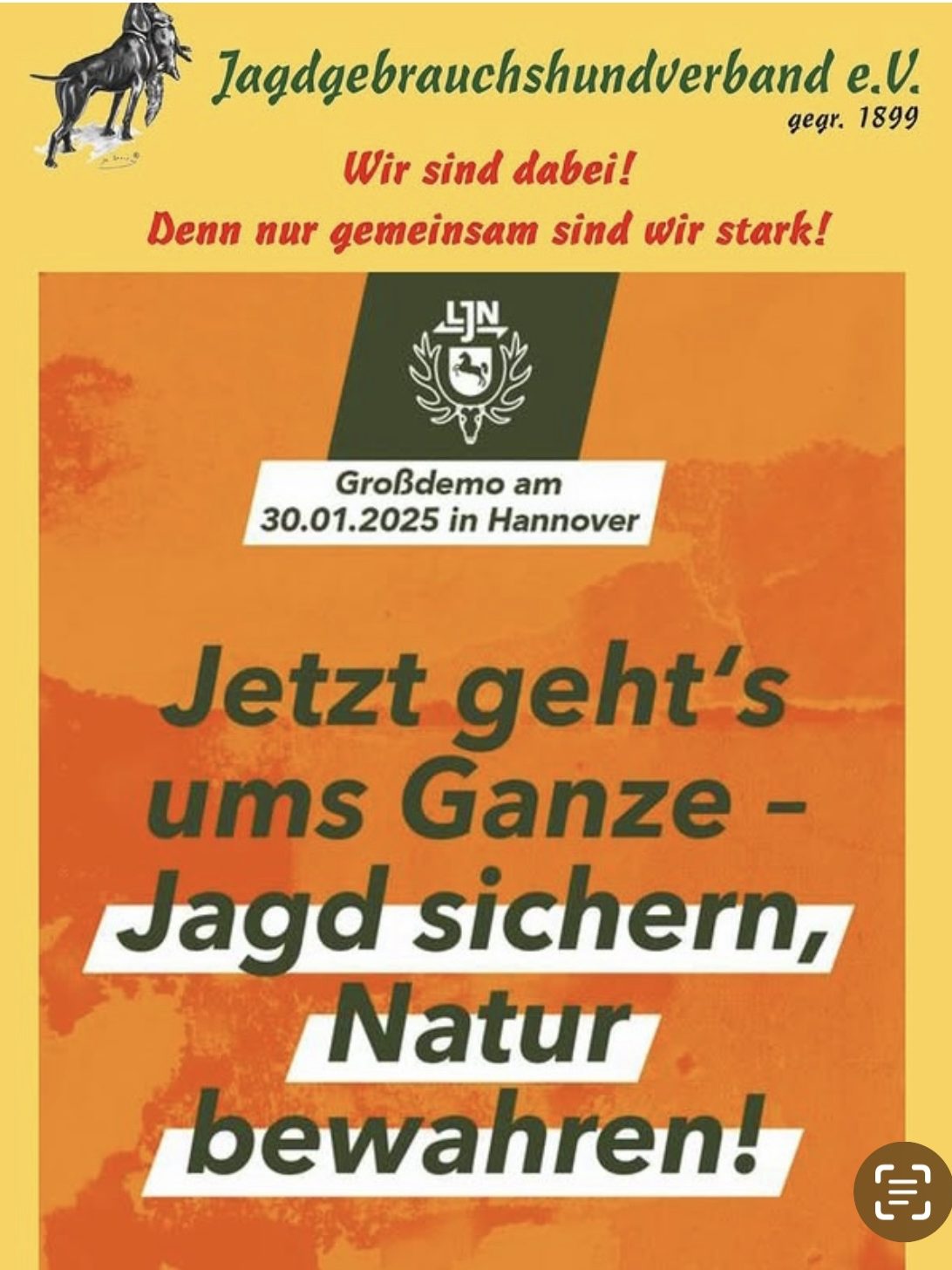 Am 30.01.2025 trafen sich über 20.000 Jägerinnen und Jäger in Hannover auf dem Schützenplatz, um dann in einem Demonstrationszug vor den Landtag zu ziehen, um gegen die Novelle des Niedersächsischen Jagdgesetzes zu demonstrieren.